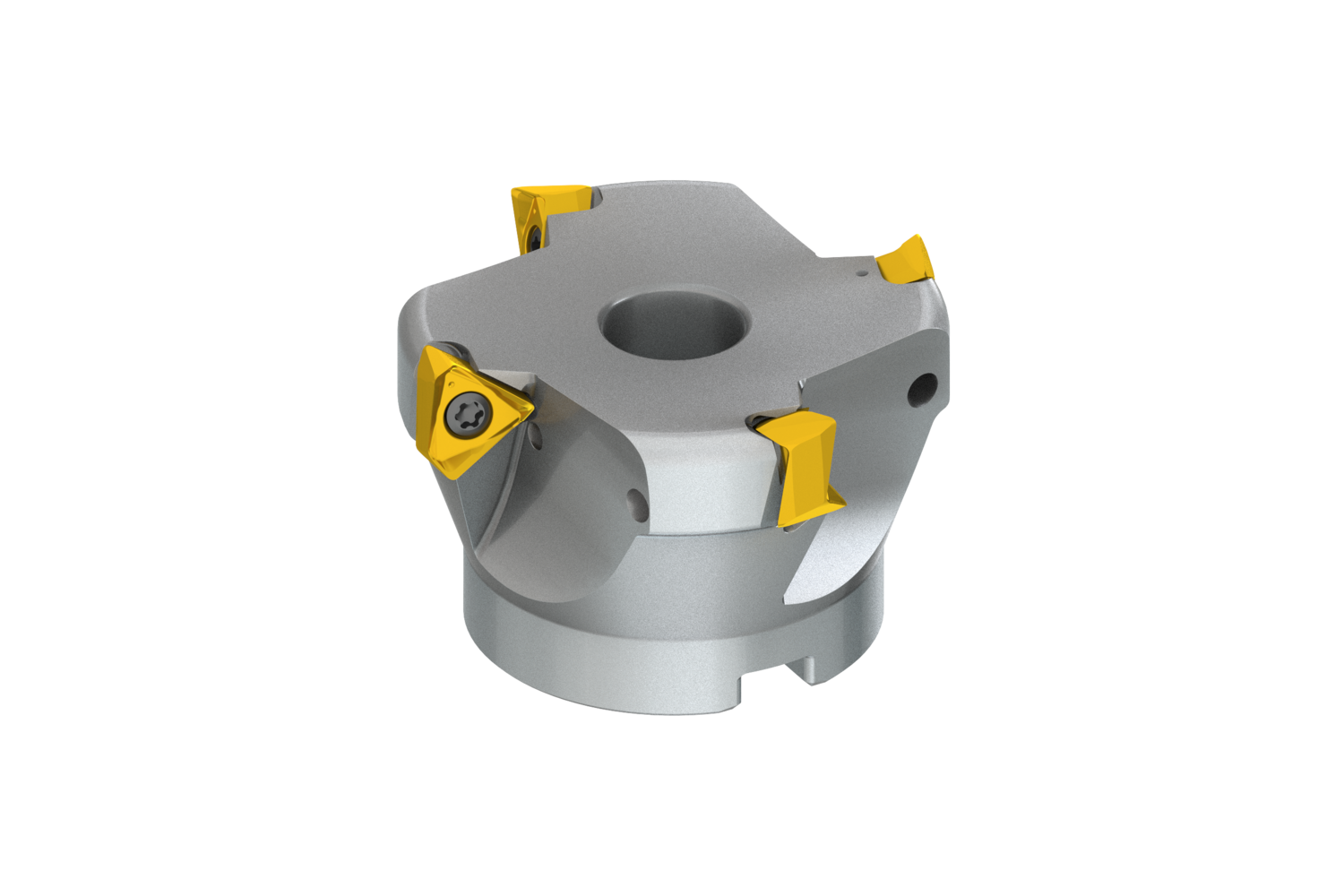 Shoulder face mill with double negative geometry which utilises 4 of TNGX 1606.. double-sided inserts, cutting diameter 2.500" with 90° approach angle and connection bore according to DIN 8030-A, , through coolant and differential pitch for face milling, shallow shoulder milling, shallow slot milling and helical milling in pre-machined holes