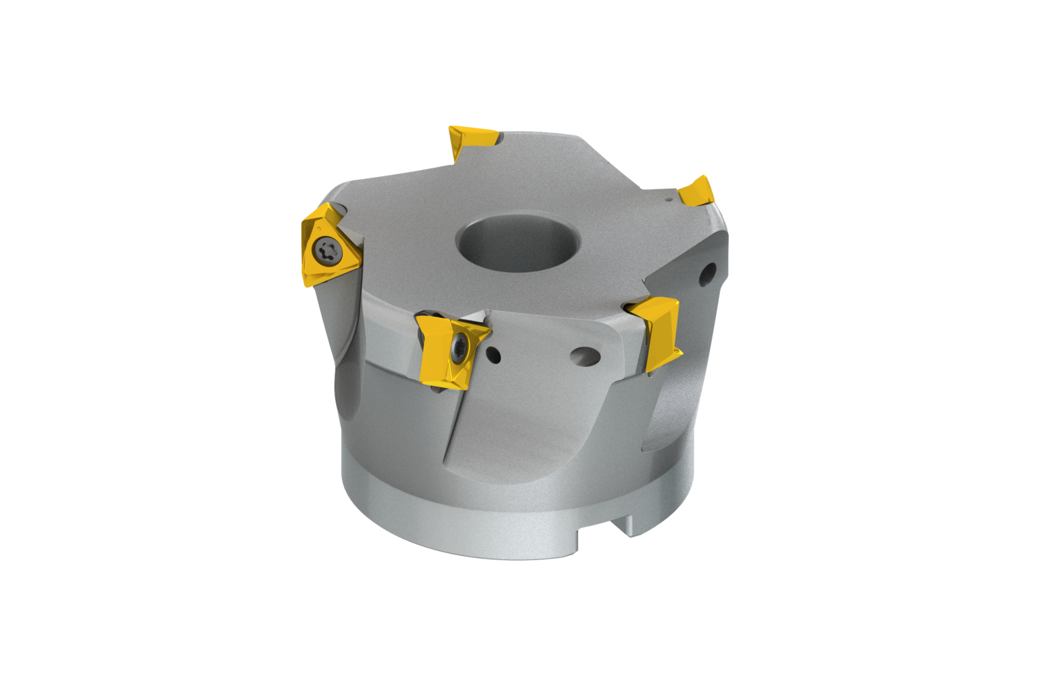 Shoulder face mill with double negative geometry which utilises 5 of TNGX 1606.. double-sided inserts, cutting diameter 3.000" with 90° approach angle and connection bore according to DIN 8030-A, , through coolant and differential pitch for face milling, shallow shoulder milling, shallow slot milling and helical milling in pre-machined holes