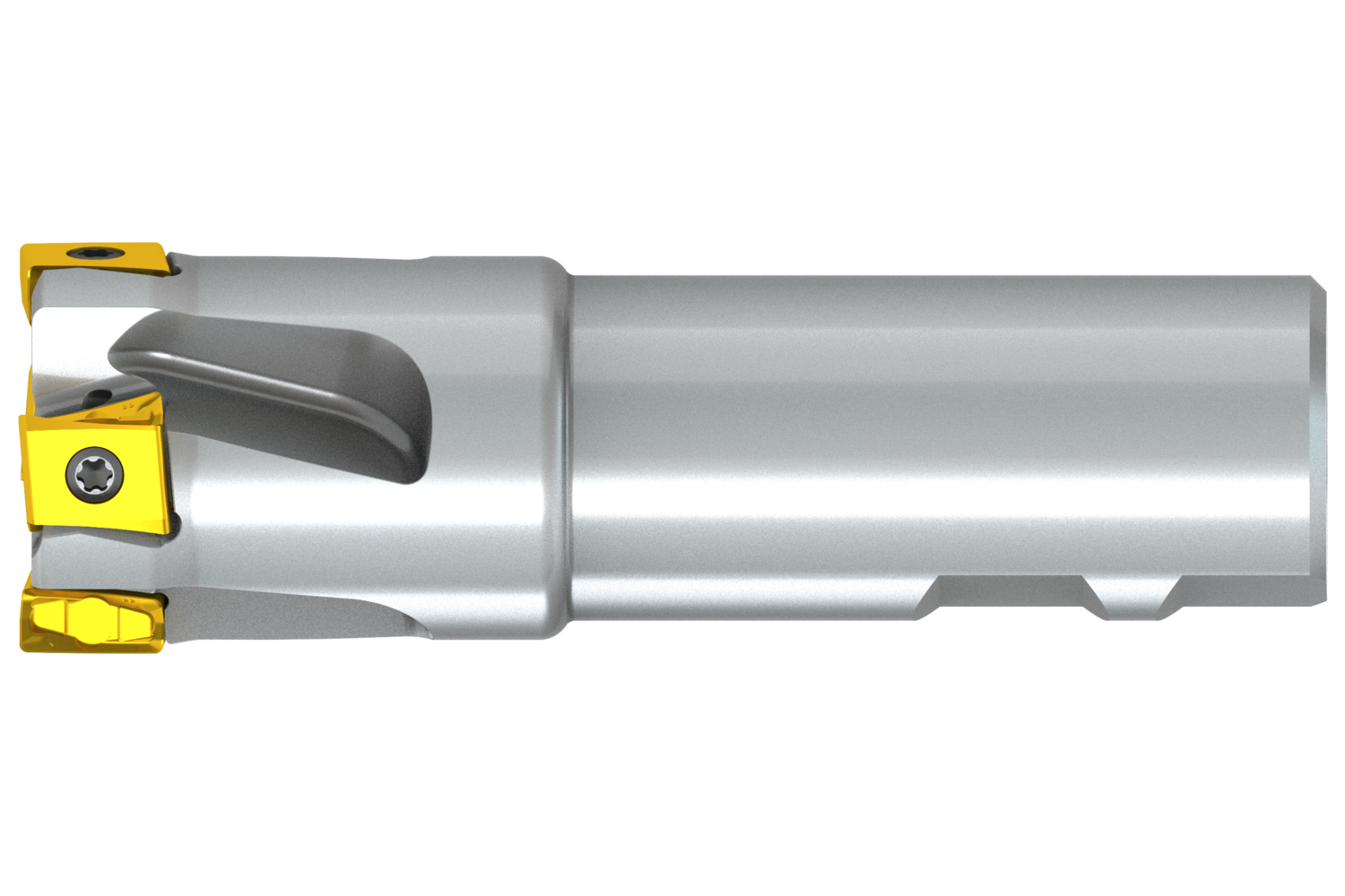 Shoulder mill with double negative geometry which utilises 4 of LNEX 1210.. double-sided inserts, cutting diameter 1.500" with 90° approach angle and 1.250" Weldon shank according to DIN 1835B, 2.000" usable and 4.724" overall length, through coolant for face milling, shallow shoulder milling, deep shoulder milling, plunge milling and shallow slot milling with a maximum depth of cut of 0.394"