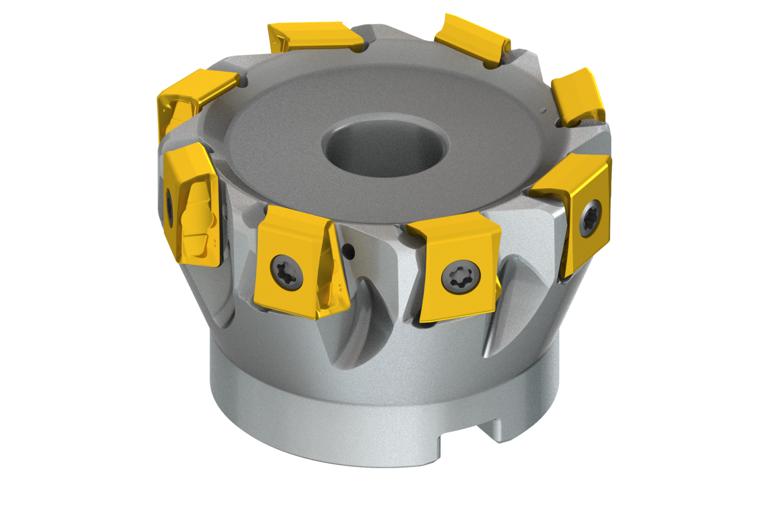 Shoulder mill with double negative geometry which utilises 8 of LNEX 1210.. double-sided inserts, cutting diameter 2.500" with 90° approach angle and 0.750" connection bore according to DIN 8030-A, 1.575" functional and, through coolant for face milling, shallow shoulder milling, deep shoulder milling, plunge milling and shallow slot milling with a maximum depth of cut of 0.394"